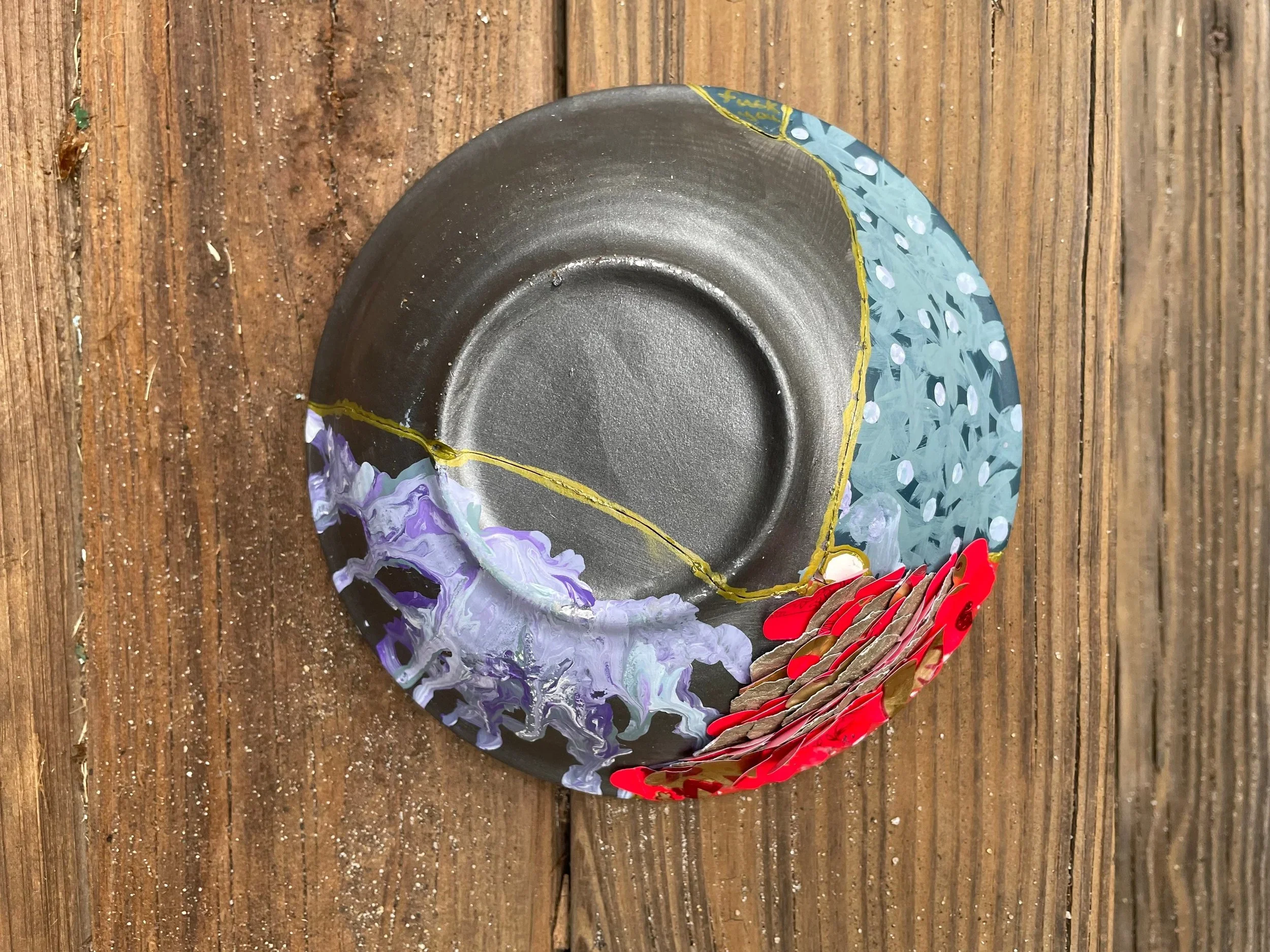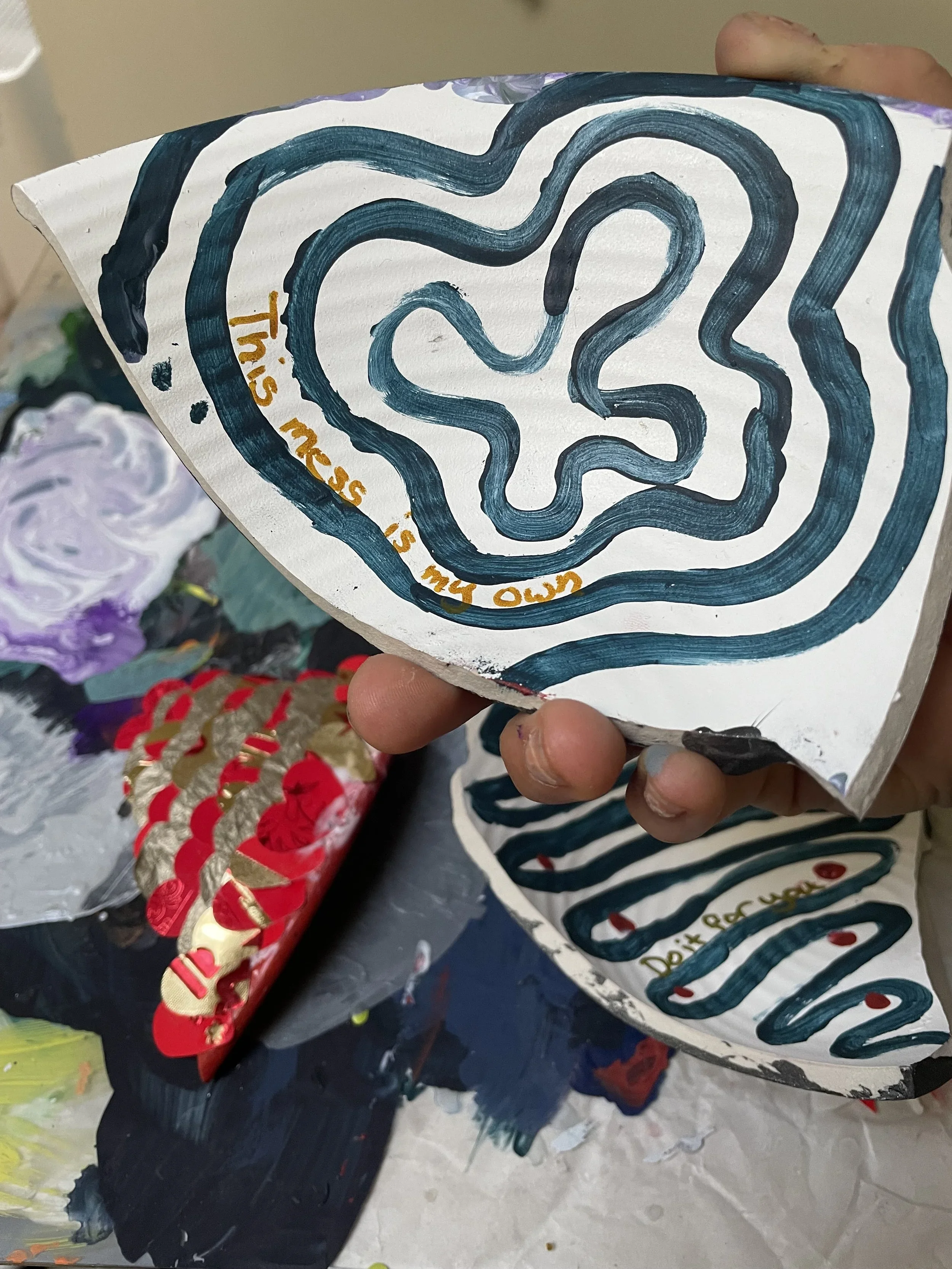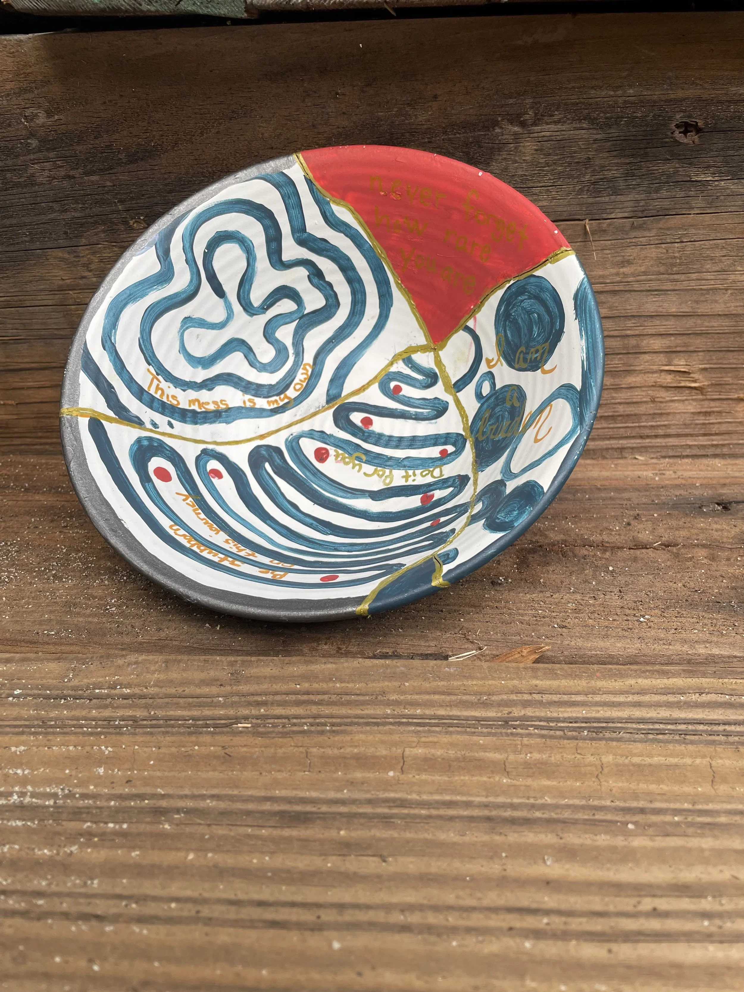 After a couple of hours of painting, collaging, and writing, my bowl was together again. Surrender is a funny thing. The idea of Surrender can bring fear and anxiety that freezes a person in their tracks. But actually allowing yourself to surrender is like a weighted blanket being lifted off of you. For me, I felt silly that I allowed the fear of Surrender to get to me over pieces of ceramic. But then I was reminded of my own life and experiences and my relationship with the idea of Surrender.
