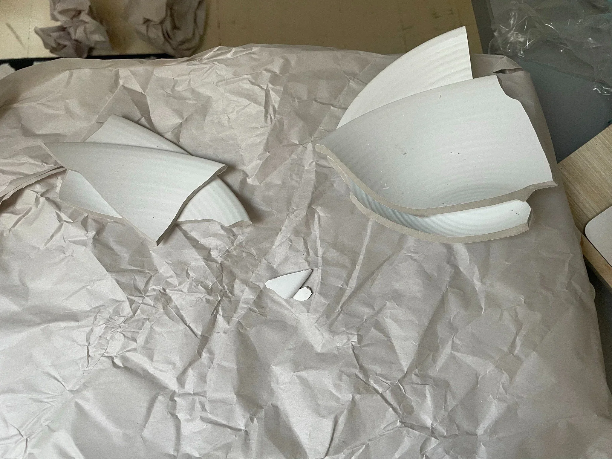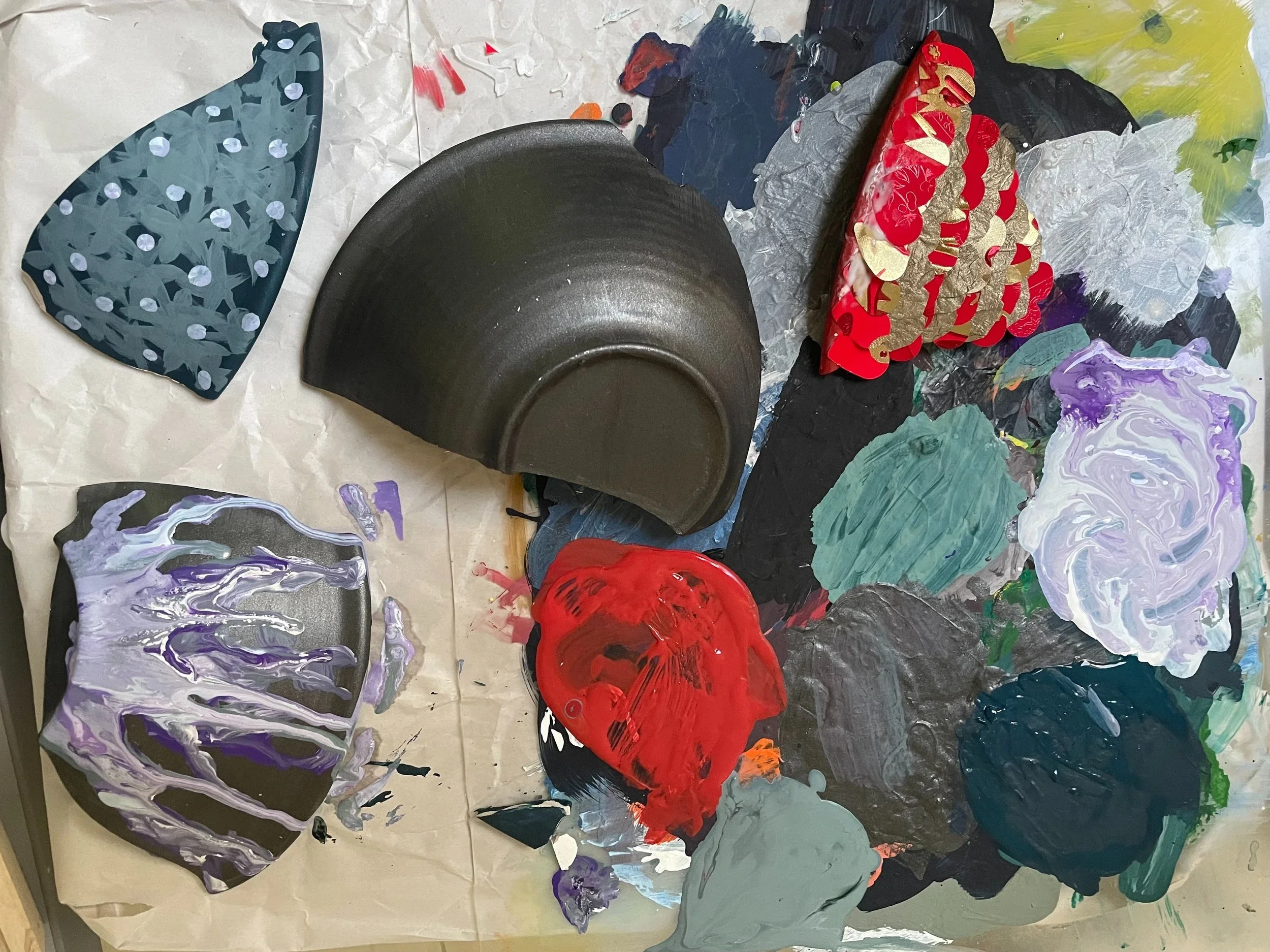 I was struggling from the first strike of the hammer. Why? My control was gone. As I took the first swing of the hammer to the bottom of the bowl, I remember thinking, “I am going to get at least 6 pieces to put back together. Not too many, it’ll be great”. Usually in Broken Bowl, we are asked to swing maybe 4-5 times at the bowl, so we don’t make pieces that are too small to work with in the time allotted. In the end, I ended up with four big pieces to paint (five if you count the one piece that was the size of a Bugles chip). I was frustrated.